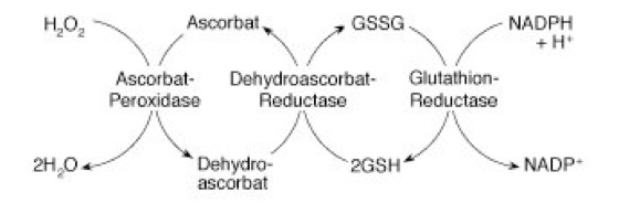 Ascorbat-Glutathion-Redoxkette, dient im Chloroplasten zum schadlosen Abbau von Wasserstoffperoxid (H2O2). Dieses entsteht enzymatisch (durch Superoxiddismutase) oder nichtenzymatisch aus dem Superoxidanion-Radikal (.O2). Dieses sehr reaktive Radikal wiederum wird im Chloroplasten durch Elektronenübertragung auf O2-Moleküle gebildet, was vermehrt bei der Photosynthese bei hohen Lichtflüssen geschehen kann (Photooxidation). Die Ascorbat-Glutathion-Redoxkette ( vgl. Abb. ) ist somit das Endglied in der Beseitigung toxischer, hochreaktiver Sauerstoffspezies im Chloroplasten (Lichtschutzmechanismen).