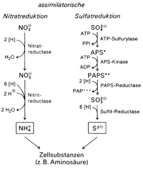assimilatorische Nitratreduktion w,Nitratassimilation,Reduktion von Nitrat und Nitrit zu Ammonium für die Biosynthese von Aminosäuren und anderen stickstoffhaltigen Verbindungen der Zelle ( vgl. Abb. ). Die assimilatorische Nitratreduktion kann von den meisten Mikroorganismen und den grünen Pflanzen ausgeführt werden. In Bakterien liegen die notwendigen Enzyme in der Regel im Cytoplasma gelöst vor. In grünen Pflanzen läuft die Nitratreduktion zu Nitrit auch im Cytoplasma, die anschließenden Reduktionen jedoch in Chloroplasten, direkt durch die Photosynthese, oder in Proplastiden der Wurzeln ab. Die Bildung von Ammonium aus Nitrat erfordert viel Reduktionskraft, die als NAD(P)H (Pilze, viele Bakterien; Nicotinamidadenindinucleotid, Nicotinamidadenindinucleotidphosphat) oder als reduziertes Ferredoxin (grüne Pflanzen und Bakterien) angeliefert wird. Stickstoffkreislauf.