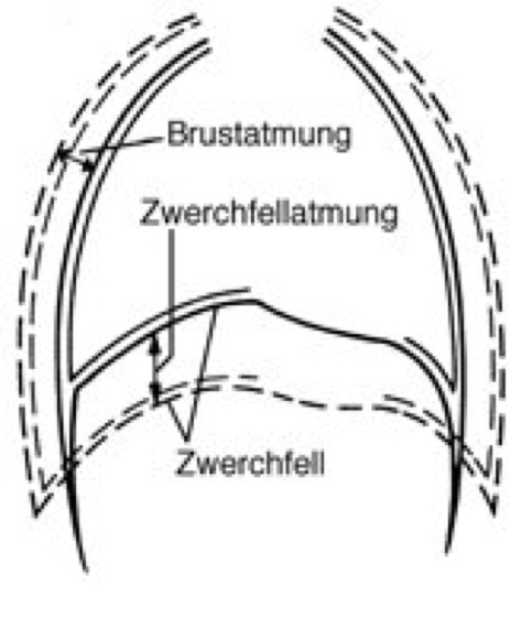 Atemmechanik, Gesamtheit der Mechanismen, mit denen lungenatmende Organismen ihre Lunge ventilieren und ein bestimmtes Volumen des Atemmediums austauschen. In der Humanphysiologie wird der Begriff wesentlich enger gefaßt und mit ihm die Analyse der Druck-Volumen- und Druck-Atemstromstärke-Beziehungen beschrieben (Compliance). Bei den Säugetieren (einschließlich Mensch) werden durch Erweiterung oder Verkleinerung des Brustraums Druckdifferenzen zwischen dem Lungenraum und der Umgebung erzeugt ( vgl. Abb. ). Die Lungen selbst besitzen keine Muskulatur für einen solchen Vorgang. Bei der Einatmung (Inspiration) erfolgt durch Kontraktion des Zwerchfells und der äußeren Zwischenrippenmuskeln die Erweiterung des Brustraums in Richtung Bauchhöhle und ein Anheben der Rippen. Damit wird ein Unterdruck von 0,4 kPa erzeugt, der bei extremer Einatmung auf 10–20 kPa "abfallen" kann (Saugventilation). Die Ausatmung (Exspiration) geschieht in der Regel passiv durch Erschlaffung von Zwerchfell und Zwischenrippenmuskeln. Elastische Kräfte der Brustwand, der Bauchdecke, des Zwerchfells und der Lunge bewirken die Verkleinerung des Brustraums und so die Rückkehr zur Atemruhelage. Wenn nötig, kann die Ausatmung durch Kontraktion der inneren Zwischenrippenmuskeln und der Muskulatur der Bauchdecke aktiv unterstützt werden. Überwiegt bei Einatmung die Kontraktion des Zwerchfells, spricht man von Zwerchfellatmung oder Bauchatmung (auch abdominale Atmung genannt), überwiegt die Kontraktion der äußeren Zwischenrippenmuskeln, liegt Brustatmung oder Rippenatmung vor (auch thorakale Atmung oder costale Atmung; vgl. Abb. ). Die Lunge ist außen, die Brustwand innen von Blättern des Brustfells bedeckt, die einen schmalen, mit Flüssigkeit gefüllten Spalt (Pleurahöhle, Brust) bilden. Flüssigkeit ermöglicht zum einen das freie Gleiten der Lunge an der Innenseite der Brustwand, zum anderen wird durch Adhäsionskräfte sowie infolge der Oberflächenspannung der Alveolen und einer Dehnung elastischer Parenchymfasern, die der Lunge das Bestreben verleihen, sich zu verkleinern, ein Unterdruck erzeugt, der verhindert, daß die Lunge aufgrund ihrer elastischen Zugkräfte kollabiert. Das Kollabieren der Lunge kann allerdings geschehen, wenn der Unterdruck durch Zustrom von Luft nach einer Schädigung der Lungenwand oder der Brustwand beseitigt wird (Pneumothorax). Bei Vögeln erfolgt der Luftaustausch am Boden durch aktives Heben und Senken des Brustbeins. Durch das Heben werden die zweigliedrigen Rippen gestreckt und so die Lunge zusammengepreßt (Ausatmung), durch Senken des Brustbeins wird die Rippenstreckung rückgängig gemacht, der Brustkorb erweitert sich in seitlicher Richtung, und die Lunge kann sich ausdehnen (Einatmung). Im Flug kommen die Luftsäcke der Vögel zum Tragen; sie fungieren dann als Blasebälge. Prinzipiell wird durch den Flugwind Luft in die Luftsäcke gepreßt und umgekehrt aus den Luftsäcken durch Zusammendrücken in die Lunge oder nach außen ( Atmungsorgane III ). – Bei Reptilien und lungenatmenden Amphibien basiert der wesentliche Teil der Atemmechanik auf Schlucken. Rippenbewegungen wirken bei Reptilien unterstützend mit, nur Schildkröten verfügen außerdem über Lungenmuskeln. Landlebende, lungenatmende Amphibien erreichen durch rhythmische Gaumenbewegungen bei geschlossener Luftröhre und geöffneten Nasenlöchern einen Austausch zwischen Mundhöhlen- und Außenluft. Anschließend werden die Nasenlöcher geschlossen und die Luftröhre geöffnet, wobei die Lunge kollabiert und sich die darin enthaltene Luft mit der Mundhöhlenluft vermischt. Durch Schlucken wird diese Mischluft dann in die Lunge gedrückt (Druckventilation). Atmung, Atmungsorgane.