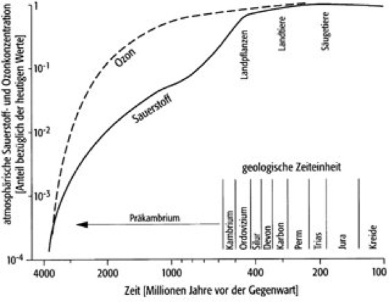 Chemische Zusammensetzung: Die heutige Erdatmosphäre besteht vor allem aus Stickstoff, Sauerstoff, Argon, Wasserdampf, Kohlendioxid sowie weiteren Spurengasen ( ä vgl. Tab. ) und unterscheidet sich vor allem durch den hohen Sauerstoffanteil grundlegend von allen derzeit bekannten Planetenatmosphären, insbesondere auch von denen der erdähnlichen Nachbarplaneten Venus und Mars. Die spezielle Entwicklung der Erdatmosphäre wird unter anderem dem Umstand zugeschrieben, daß die irdischen Temperaturen die dauerhafte Existenz von Wasser in seiner flüssigen Form zuließen. Die Evolution der Erdatmosphäre ist direkt an die Entwicklung der geologischen, biologischen und hydrologischen Verhältnisse auf der Erde gekoppelt. Während die Uratmosphäre hohe Anteile von Wasserstoff enthielt ( ä chemische und präbiologische Evolution ) und reduzierende Eigenschaften aufwies, war die Entstehung von Sauerstoff (O2) ein "Abfallprodukt" ersten bakteriellen Lebens (Leben). Schließlich erlaubte das aus O2 entstandene Ozon aufgrund seiner Absorption kurzwelligen Lichts (Ultraviolett) die Verlagerung des Lebensraums vom Wasser auf festes Land und ermöglichte die Evolution des Lebens bis zu seiner heutigen Form. Heute hat sich der Sauerstoff-Kohlendioxid-Stoffwechsel im Energiesystem Höherer Lebewesen durchgesetzt. In der Abb. ( ä vgl. Abb. ) ist die zeitliche Entwicklung der atmosphärischen Sauerstoff- und Ozonkonzentration in Verbindung mit der Entwicklung des Lebens auf der Erde skizziert.