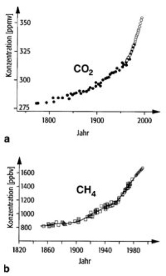 Atmosphäre Anthropogen beeinflußter Anstieg des Mischungsverhältnisses der atmosphärischen Spurenstoffe a Kohlendioxid (gefüllte Kreise: Daten aus Eisbohrkernen, offene Kreise: in situ-Messungen), b Methan. Die Einheit ppmv (bzw. ppbv) bedeutet "parts per million (bzw. billion) volume", d. h., 1 ppmv ist 1 Volumenteil in 1 Million (ppm), 1 ppbv in 1 Milliarde (engl. billion = Milliarde). |