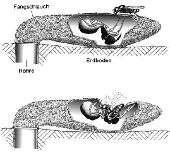 Prinzip des Beutefangs mit einem Gespinstschlauch (zur Demonstration aufgeschnitten)