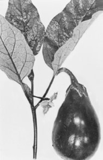 Aubergine w [ober–- –schine; von franz. aubergine = tiefviolette Eierfrucht, über katalanische Vermittlung von arabisch al-bādindschān, Wort persischer Herkunft], Eierfrucht, ital. Melanzane, Solanum melongena, einjährige, bis zu 100 cm hohe, krautige Pflanze mit lang gestielten, gelappten bis oval-eiförmigen, unterseits filzig behaarten Blättern und ca. 3 cm breiten, bläulichen bis violetten Blüten. Aus dem oberständigen Fruchtknoten entsteht eine bis 30 cm lange und 10 cm dicke, mehr oder minder kugelige, eiförmige oder längliche, bis 1 kg schwere Beere von elfenbeinweißer oder dunkelpurpurner bis schwarzer Farbe ( vgl. Abb. ). Das Innere der Frucht (Inhaltsstoffe vgl. Tab. ) weist keine Fächerung auf, sondern ist mit einem weißlich-grünlichen, schwammartigen, relativ saftarm erscheinenden Gewebe ausgefüllt, in das die flachen, 2–4 mm breiten, bräunlichen Samen eingebettet sind. Die aus dem tropischen Hinterindien stammende Pflanze kam wahrscheinlich durch die Araber im 13. Jahrhundert nach Europa. Heute wird sie in einer Vielzahl von Sorten besonders in Asien und dem Mittelmeerraum kultiviert und liefert mit ihren Früchten ein weltweit geschätztes, schmackhaftes Gemüse, das vor allem gekocht oder gebraten verzehrt wird. Die Weltproduktion belief sich 1994 auf fast 9 Millionen t ( vgl. Tab. ). Kulturpflanzen V.