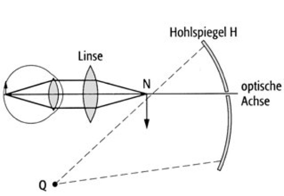 Funktionsweise: Licht der Quelle Q gelangt über den Hohlspiegel H in den hinteren Teil des Auges, der über die beiden Linsen als reelles Bild N außerhalb des Auges abgebildet wird.