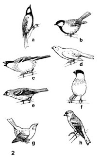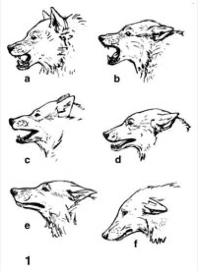 1 Ausdrucksstudien am Wolf: a Drohung, b Drohung mit Unsicherheit, c Drohung sehr schwach, d Drohung schwach – Unsicherheit sehr stark, e Ängstlichkeit – Schmerzschrei-Situation, f Feind vis-à-vis – Abwehr, Unsicherheit, Unterlegenheit. 2 Typische Verhaltensformen bei Singvögeln: a Kopfhochdrehen und b Unterwerfungshaltung (Kohlmeise), c Vorwärtsdrohen gegen Rivalen (Gimpel), d Balzhaltung zum Weibchen (Kanarienvogel), e laterale Balz breitseits zum Weibchen (Buchfink), f Balzhaltung breitseits zum Weibchen (Gimpel), g Aufforderungsgeste des Buchfinkenweibchens, h Haltung des Buchfinkenmännchens vor der Begattung