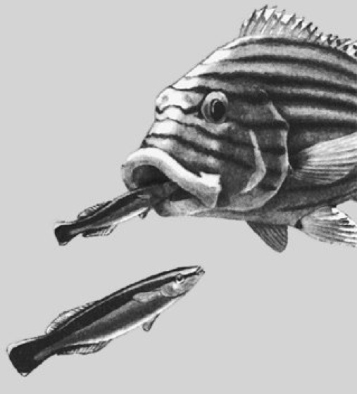 Der Putzerfisch (Labroides dimidiatus) schwimmt in das Maul eines Dicklippenfisches, um unter den abgespreizten Kiemendeckeln nach Parasiten zu suchen. Als Auslöser für die "Kunden" des Putzers dienen seine Form, die Größe und die typische Färbung, dazu der Putzertanz, ein hüpfendes Auf- und Abschwimmen. Die Kunden wiederum lösen durch ruhiges Verharren, durch Maulöffnen und Abspreizen der Kiemendeckel das Putzen aus. Durch die aufeinander abgestimmten Auslöser wird die Symbiose zum gegenseitigen Nutzen möglich.
