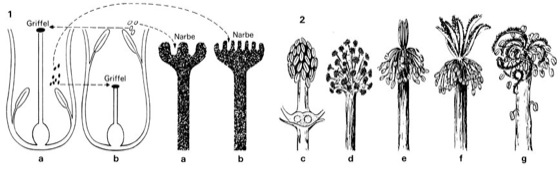 Proterandrie (Protandrie): Staubblätter reifen zuerst; 2 gibt die Blühvorgänge bei der Käseblume (Malva) wieder: c miteinander verwachsene Staubblätter bilden Pollen; d bei Reife weichen sie auseinander; e die Staubfäden verwelken, die Narben kommen zum Vorschein; f die reifen Narben weichen auseinander, in diesem Zustand kann die Blüte bestäubt werden; g wenn die Kreuzbestäubung ausbleibt, krümmen sich die Narben über die Staubgefäße, so daß noch Selbstbestäubung stattfinden kann. Andere Beispiele sind Korbblütler, Doldenblütler, Salbei, Glockenblumen.