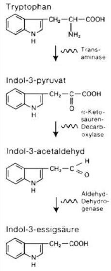 Auxine [von griech. auxanein = wachsen lassen, vermehren], natürliche und synthetische Wuchsstoffe, die das Streckungswachstum von Sprossen fördern und das Längenwachstum der Wurzeln hemmen. Historisch wurden Auxine als erste pflanzliche Hormone (Phytohormone) entdeckt, und zwar im Zusammenhang mit dem Tropismus: Schon C.R. Darwin beobachtete, daß ein wachstumsförderndes Signal von der Spitze einseitig belichteter Coleoptilen zur Basis des Organs wandert. Unabhängig voneinander beschrieben Cholodny für den Gravitropismus (1927) und Went (1928) für den Phototropismus, daß ein Wuchsstoff infolge der Reizung über den Coleoptilquerschnitt verschoben wird. Die sog. Cholodny-Went-Theorie führte dann zur Isolierung dieses Wuchsstoffs ("Auxin") durch Went und Thimann, der Indol-3-essigsäure oder β-Indolylessigsäure (IES; vgl. Abb. ). Als Biotest für die Aktivität des Auxins diente dabei der Hafercoleoptilenkrümmungstest (Avenatest). Dabei werden mit der zu bestimmenden Lösung getränkte Agarblöckchen einseitig auf die Schnittfläche gekappter Hafercoleoptilen aufgesetzt. Das durch Auxin hervorgerufene, kaum sichtbare zusätzliche Wachstum der einen Coleoptilflanke führt dabei zu einer gut meßbaren Krümmung. Hauptbildungsstätten der IES in der Höheren Pflanze sind embryonales Gewebe, sich entwickelnde Samen, photosynthetische Organe, Endknospen und junge Blätter. Auch in Speichergeweben, Coleoptilen und Pollen wird sie gefunden. Die Biosynthese der IES erfolgt im sog. Indol-acetonitril-Weg aus Tryptophan über Indol-3-pyruvat und Indol-3-acetaldehyd ( vgl. Abb. ), wobei IES über eine Nitrilase aus der Vorstufe Indolacetaldoxim entsteht. Abgebaut wird sie durch enzymatische Oxidation. Daneben gibt es jedoch noch einen zweiten, Tryptophan-unabhängigen Weg, da Arabidopsis-Mutanten, die kein Tryptophan bilden können, sowohl die Vorstufe Indolacetaldoxim als auch IES in normalen Mengen aufweisen. Der IES-Transport erfolgt entweder im Phloem (nicht polarisiert) oder im Parenchym (strikt polar von Zelle zu Zelle in basipetaler Richtung). Die Wirkungen der IES sind sehr vielfältig und konzentrationsabhängig, wobei IES als Auslöser fungiert und die Spezifität der Reaktion vom jeweiligen Differenzierungszustand der Zelle abhängt. Beispiele für IES-Wirkung sind apikale Dominanz, Förderung des Streckungswachstums und der Teilungsaktivität von Zellen (Kambium) sowie rasche Wurzelbildung (Wurzel; vgl. Abb. ) und Bildung von Adventivwurzeln (Adventivbildung) und Seitenwurzeln. Praktische Anwendung finden Auxine in der Landwirtschaft und Gärtnerei bevorzugt als synthetische Auxine mit struktureller Ähnlichkeit zur IES und mit ähnlicher Wirkung. Sie werden meist nicht oder nicht so schnell wie die IES durch pflanzeneigene Enzyme abgebaut, so daß eine nachhaltigere Wirkung erzielt wird. Synthetische Auxine werden unter anderem zur Stecklingsbewurzelung, Parthenokarpie (Fruchtbildung ohne vorhergehende Befruchtung) und Beschleunigung der Fruchtreife eingesetzt, aber auch zur Unkrautvernichtung (Herbizide). Ein wichtiges synthetisches Auxin ist die Dichlorphenoxyessigsäure (2,4-D; vgl. Abb. ), ein Herbizid; weitere sind Indolylbuttersäure sowie Naphthylessigsäure. Antiauxine, Auxinantagonisten, Auxin-Binde-Protein, Auxinrezeptor, Auxinvorstufen, Entlaubungsmittel, Fitting (J.), Gibberelline, Glucobrassicin, Haberlandt (G.J.F.), Indolylessigsäure-Oxidase, Knospenruhe, Korrelation, Wachstumsregulatoren.