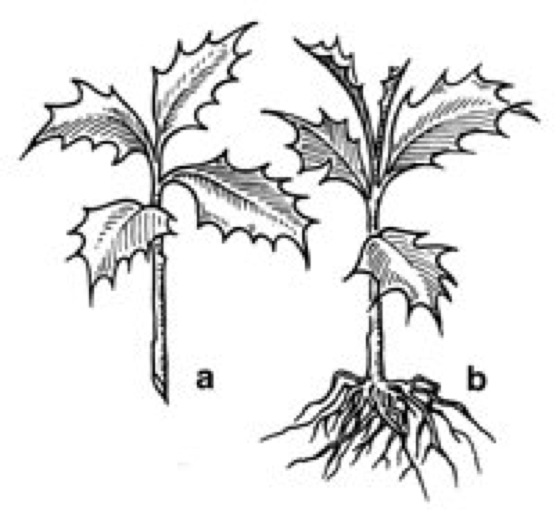 Bewurzelung von gleich alten Stecklingen der Stechpalme, a ohne Wuchsstoffbehandlung, b mit β-Indolylessigsäure (früher Heteroauxin genannt)