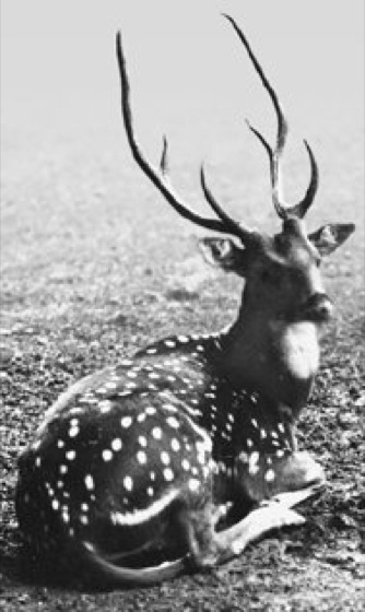 Axishirsch, Axis axis, gehört ebenso wie der zur gleichen Gattung (Fleckenhirsche) gestellte Schweinshirsch zur Unterfamilie Cervinae oder Echthirsche. Der Axishirsch lebt in seinem natürlichen Verbreitungsgebiet, Indien und Sri Lanka, in Herden aus 10–30 Individuen mit 2 oder 3 (männlichen) Hirschen darunter. Aufgrund seines wohl lebhaftesten Fleckenkleids ( vgl. Abb. ) unter allen Hirsch-Verwandten, das zeitlebens erhalten bleibt, wurde der Axishirsch als attraktiv empfundenes Jagdwild in viele Länder eingeführt, in Europa bereits im Altertum durch die Römer. In Neuseeland stellt die Ansiedlung der Axishirsche wegen ihrer hohen Fortpflanzungsrate inzwischen eine Bedrohung der "Landschaft" durch Fraßschäden dar. Trinilfauna, Voraugendrüse.