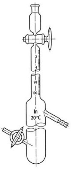 Azotometer s [von *azoto -], Gerät zur Bestimmung von vorzugsweise sehr kleinen Gasvolumina bei der Elementaranalyse, vor allem des Volumens von bei der Zersetzung organischer Stickstoffverbindungen freiwerdendem Stickstoff. Das aus Glas bestehende Azotometergefäß wird zunächst vollständig mit einer geeigneten Sperrflüssigkeit gefüllt, die das zu messende Gas nicht absorbiert (Absorption). Dann wird das Gas von unten in das Meßgerät eingeleitet, wobei es die Flüssigkeit verdrängt. Das Gasvolumen wird auf einer auf dem Gefäß angebrachten Skala abgelesen ( vgl. Abb. ). Der Meßbereich eines Azotometers kann bis zu 1,5 ml herabreichen, die Fehlergrenzen betragen mehr als 0,03 ml.