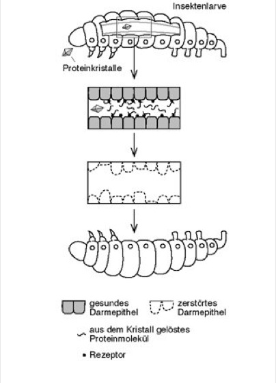 Bacillus-thuringiensis-Toxins, Abk. Bt-Toxin, insektizid wirkendes Protein (insektizide Proteine), das von Bacillus thuringiensis während der Sporenbildung (Endosporen) als Protoxin gebildet wird. Das für dieses Protein codierende Gen wurde bereits isoliert und charakterisiert. Während der Sporenbildung synthetisiert Bacillus thuringiensis große Mengen des Proteins, das sich zu Kristallen zusammenlagert. Nimmt ein Insekt mit seiner Nahrung diese Kristalle auf, so werden die Proteine von den Verdauungssäften des Insekts freigesetzt und gespalten und damit zum wirksamen Toxin umgewandelt. Die Spaltprodukte binden an Rezeptoren der Darmwand, dringen in die Zellmembran des Darmepithels ein und zerstören diese durch Porenbildung ( vgl. Abb. ). Dadurch kommt es zu einer Vermischung des Darminhalts mit der Hämolymphe und zum Tod (Sepsis) des Insekts. Da nur wenige, nahe verwandte Insektenarten Bindungsstellen für das Bacillus-thuringiensis-Toxin besitzen, kann das Toxin zur biologischen Schädlingsbekämpfung verwendet werden. Heute sind über 30 ähnliche Proteine mit unterschiedlichen Wirkspektren und deren Gene bekannt. Sie wurden aus anderen Bacillus-Arten (z. B. Bacillus larvae, Bacillus sphaericus) isoliert. Das Bacillus-thuringiensis-Toxin wirkt auf Schmetterlingslarven, andere Toxine auf Stechmückenlarven, Käfer oder Fadenwürmer letal. – Da die Toxine unter UV-Strahlung rasch ihre Wirkung verlieren, ist ihr Einsatz zur Zeit noch gering. Um dieses Problem zu umgehen, werden zwei Wege beschritten: 1) Die für das Toxin codierenden Gene werden solcherart verändert, daß Toxine von längerer Lebensdauer entstehen, und die Sporen dieser veränderten Bakterien werden auf die Felder ausgebracht. 2) Die Gene für das Toxin werden in das Genom von Nutzpflanzen eingeführt. Insekten, die an diesen Pflanzen fressen, entwickeln sich langsamer oder sterben sogar ganz ab. Mehrere solcher sog. Bt-Pflanzen sind schon auf dem Markt, darunter so wichtige Nutzpflanzen wie Baumwolle (Baumwollpflanze), Kartoffeln (Kartoffelpflanze), Mais, verschiedene Gemüsesorten (Gemüse) und Reis. Da diese Pflanzen nicht nur bei akutem Insektenbefall, sondern ständig Bt-Toxine erzeugen, wird dadurch die Verbreitung von toxinresistenten Insektenpopulationen begünstigt. Insektenresistenz gegen Bt-Toxine ist allerdings schon vor der Einführung transgener Pflanzen bekannt geworden – vermutlich durch exzessiven Einsatz des Toxins bei der biologischen Schädlingsbekämpfung. Anfang der 80er Jahre trat dieses Problem erstmals in Zuckerrohrplantagen in Hawaii auf. Im Zusammenhang mit der Neueinführung von Bt-Baumwolle Mitte der 90er Jahre sind auch in Nordamerika Fälle von Massenbefall durch Bt-resistente Insekten beobachtet worden. Um die Resistenzentwicklung zu verlangsamen (sog. resistance management), empfehlen die entsprechenden Firmen, das transgene Saatgut mit konventionellem Saatgut zu mischen, um so den Selektionsdruck auf die Insektenpopulation zu vermindern. In den meisten Fällen scheint die Resistenz auf eine Veränderung in der Struktur der Rezeptoren im Insektendarm zurückzugehen, wodurch die Bindung des Toxins vermindert wird. Manche dieser Veränderungen verleihen sogar eine multiple Resistenz (d. h. gegen eine ganze Reihe von Bt-Toxinen; Mehrfachresistenz). Darüber hinaus kommen jedoch auch komplexere Resistenzstrategien vor, wie pH-Änderungen der Verdauungssekrete (wodurch die Freisetzung der Toxine im Darm verhindert wird) oder Verhaltensänderungen (bevorzugter Fraß von Pflanzenteilen mit niedrigem Toxinpegel). Langfristig wird im Rahmen des "resistance management" versucht, neue, wirksamere Toxine zu finden, gegen die noch keine Resistenzen vorhanden sind. Außerdem wird daran gearbeitet, das Toxin nicht stetig, sondern induzierbar zu bilden, so daß die Pflanzen nur bei massivem Schädlingsbefall Bt-Toxine erzeugen. Alternativ wird das Toxin-Gen unter der Kontrolle von gewebsspezifischen Promotoren in das pflanzliche Genom eingeführt, so daß nur bestimmte, besonders wichtige Pflanzenorgane (bei der Baumwolle etwa die Blütenknospen, aus denen sich die Samenkapseln entwickeln) geschützt sind. Biopestizide, Entwicklungshemmer, gentechnische Schädlingsbekämpfung.