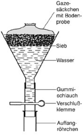 Baermann-Trichter, Gerät zum Austreiben von Bodenorganismen (wie Fadenwürmer und Enchytraeidae) aus Bodenproben. Das Probenmaterial wird in einem Gazesäckchen auf ein Sieb in einem wassergefüllten Trichter gelegt ( vgl. Abb. ). Bei Erwärmung der Bodenprobe verlassen die Tiere das Gazesäckchen und gelangen über das Sieb in den Wassertrichter, aus dem sie leicht abgelassen werden können. Berlese-Trichter.