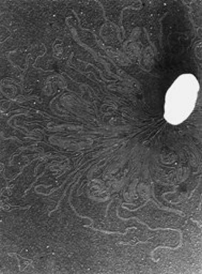 Elektronenmikroskopische Aufnahme des DNA-Moleküls von Escherichia coli nach Freisetzung aus einer geplatzten (lysierten) Zelle; links unten ein kleines ringförmiges Plasmid-DNA-Molekül
