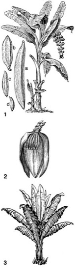 Bananengewächse [von Banane], Musaceae, Familie der Blumenrohrartigen, nach der älteren Systematik mit den 2 Gattungen Musa (Banane) und Ensete, nach der neueren Systematik mit 6 Gattungen, von denen die Mehrzahl aus den aufgelösten Strelitziaceae stammt ( ä vgl. Tab. und ä Bananengewächse ); pantropisch verbreitete Familie. Musa und Ensete sind große, milchsaftführende Stauden (nicht verholzend), die, wie die anderen Gattungen, aus ihren übereinandergreifenden Blattscheiden Scheinstämme (Scheinstamm) bilden. Sie besiedeln vorwiegend gestörte Standorte im tropischen Tiefland; als Pionierpflanzen erreichen sie sehr schnell (in ein bis wenigen Jahren) große Höhen (bis zu 15 m). Die Blüten sind zygomorph, mit 6 Blütenhüllblättern (bei der Banane sind 5 davon verwachsen) und monoklin oder diklin. Von den 6 Staubblättern ist eines zu einem Staminodium reduziert; der Fruchtknoten ist unterständig und dreifächrig, mit zahlreichen zentralwinkelständigen Samenanlagen. Die Banane (Musa; ä vgl. Abb. und Kulturpflanzen VI) vermehrt sich mittels Rhizomen vegetativ; die großen (Spreite bis 6 m lang), schraubig stehenden Laubblätter besitzen eine dicke Mittelrippe und davon fast rechtwinklig abgehende, parallele Seitennerven, entlang derer die eigentlich ganzrandigen Blätter oft vom Wind zerschlitzt werden. Nach etwa einem Jahr vegetativer Entwicklung schiebt sich durch den Scheinstamm der Blütenstand hindurch, der aus jeweils 2 Reihen kollateraler Beiknospen besteht, die in den Achseln gefärbter Tragblätter sitzen. Die vordersten Blüten der hängenden Blütenstände sind rein staminat, darauf folgen monokline, deren Fruchtknoten verkümmern, die untersten sind rein karpellat und entwickeln sich bei Kulturpflanzen ohne Bestäubung zu den samenlosen (es finden sich nur schwärzliche Rudimente der Samenanlagen) Fruchtbündeln. Die Früchte sind im botanischen Sinne Beeren (Beere) mit einer aus Blütenbodengewebe und Exokarp gebildeten Schale und einer von Meso- und Endokarp gebildeten eßbaren Pulpa. Als Urheimat der Banane wird Südostasien angesehen. Dort kommen Musa acuminata und Musa balbisiana vor, die als Stammeltern der über 200, teilweise durch Hybridisierung entstandenen, teils diploiden, meist aber triploiden Kultursorten gelten. Die Bananenpflanzen benötigen feuchtwarmes Klima – mit durchschnittlich ca. 25 °C und bis zu 2000 mm Jahresniederschlag – und gute Böden. Alle 15 bis 20 Jahre müssen die Kulturen erneuert werden; dies erfolgt vegetativ über vom Mutterrhizom abgetrennte Schößlinge. Mit einer Welternte, die 1994 rund 53 Millionen t (Obstbanane) betrug, ist die Banane eine wichtige Weltwirtschaftspflanze ( ä vgl. Tab. ). Der Ertrag liegt im Mittel bei 14 t/ha. Hauptexportländer sind die mittelamerikanischen Staaten Ecuador, Honduras, Costa Rica und Panama. Für den Export bestimmte Früchte werden unreif geerntet, in Kühlschiffen transportiert und im Einfuhrland in Lagerhäusern nach Bedarf durch Zugabe von Ethylen zur Reife gebracht. – Krankheitserreger, meist Pilze und Viren, zerstören bis zur Hälfte der Bananenernte. Anfang der 1990er Jahre gelang es erstmals, durch ein Gewebekulturverfahren pilzresistente Bananen zu schaffen. Wenige Jahre später glückte die Einschleusung eines Modellgens mit Hilfe von "Genkanone" und Plasmiden. Für die Züchtung neuer schädlingsresistenter Bananenvarietäten, die bisher unter anderem wegen des dreifachen Chromosomensatzes sehr schwierig war, dürften damit neue Wege offenstehen. – Die Banane zeichnet sich durch einen mit 25% sehr hohen Kohlenhydratanteil aus. Dieser liegt im unreifen Zustand in Form von Stärke vor, die in der Obstbanane bei der Reifung zum Teil in Zucker umgewandelt wird. Bananen werden mit einem Gehalt von ca. 20 % verdaulichen Kohlenhydraten und aufgrund ihres Nährwerts, Vitamin-A- und Vitamin-C-Gehalts ( ä vgl. Tab. ) unter anderem in der Rohkost- und Babynahrung sehr geschätzt. Die 2–3 m hohe Zwergbanane (Musa nana) mit ihren kleinen und sehr süß schmeckenden Früchten wird unter anderem auf den Kanarischen Inseln angebaut. In der Mehlbanane (Musa paridisiaca normalis), die in vielen tropischen Ländern ein wichtiges Grundnahrungsmittel darstellt, erfährt die Stärke keine Umwandlung. "Fufu" ist ein in Zentralafrika verbreitetes Gericht, das aus der Mehlbanane und einigen Zutaten bereitet wird. Bananen kommen auch getrocknet auf den Markt; weiterhin kann aus ihnen ein Bananenmehl oder – in Afrika – Bananenbier gewonnen werden. Die Faserbanane (Musa textilis), eine Bananenart der Philippinen, liefert den Manilahanf (Abaca; Leitbündel der Blattscheiden), der zu Schiffstauen und Säcken verarbeitet wird. – Wichtigste Art der Gattung Ensete ist Ensete ventricosum (Musa ensete), die in Zentral- und Ostafrika kultiviert wird; die stärkereiche Grundachse und der junge Sproß werden gekocht verzehrt, außerdem wird daraus ein Mehl gewonnen. Zur Gattung Strelitzia (Paradiesvogelblumen, Strelitzien) zählen 5 Arten, die im tropischen Amerika verbreitet sind; Strelitzia reginae mit großen, orange-blauen Blüten wird bei uns als Schnittblume angeboten. Die monotypische Gattung Ravenala war ursprünglich nur auf Madagaskar verbreitet, doch wird Ravenala madagascariensis ( Afrika VIII ) wegen ihrer attraktiven Blattfächer als Zierbaum heute in den gesamten Tropen und Subtropen kultiviert; die deutschen Namen "Baum der Reisenden" oder "Quellbaum" spielen auf die stark wasserhaltigen hohlen Blattscheiden an, aus denen nach Anstechen bis zu 1,5 l Wasser gewonnen werden können. Heliconia umfaßt ca. 150, im tropischen Amerika verbreitete, großlaubige Arten, von denen viele wegen ihrer attraktiven Blütenstände mit gelben, orangen bis scharlachroten Deckblättern kultiviert werden. Phenakospermum ist mit der in Südamerika verbreiteten, bis zu 10 m hohen Art Phenakospermum guyannense eine monotypische Gattung. Achselknospe, Fruchtbildung, Fruchtsäuren (Tab.), Kulturpflanzen