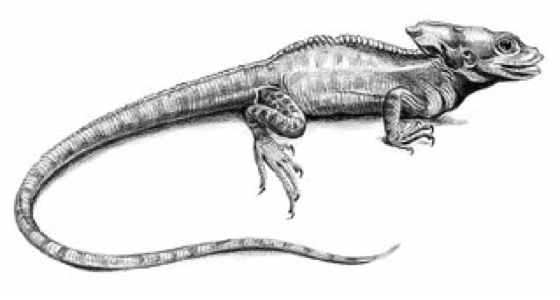 Basiliscinae [von griech. basiliskos = kleiner König; Basilisk], Basiliskenartige, Unterfamilie der Leguane mit den 3 Gattungen Basilisken, Kronenbasilisken und Helmleguane; mit typischem Kopfhelm; nur von Südmexiko bis Ecuador verbreitet. Baumbewohner in Ufernähe, doch können die bis 80 cm langen (davon Schwanzlänge 55 cm) Basilisken (Basiliscus) auch ausgezeichnet schwimmen oder tauchen bzw. auf der Wasseroberfläche (nur mit den Hinterbeinen) ein Stück laufen, wobei sie eine Geschwindigkeit bis zu 12 km/h erreichen können; sie verzehren Kleintiere und Früchte. Der in Kolumbien und Mittelamerika vorkommende Helmbasilisk (Basiliscus basiliscus;vgl. Abb. ) wird ca. 80 cm lang; das Männchen des bis zu 70 cm großen Stirnlappenbasilisken (Basiliscus plumifrons) aus Costa Rica trägt neben dem 6 cm hohen, von Knochenstrahlen gestützten zackigen Rückenkamm und der großen Hinterkopfhaube einen kleineren Stirnauswuchs. Ähnlich groß werden die langschwänzigen Kronenbasilisken (Laemanctus); so entfallen bei dem in den Regenwäldern von Süd-Mexiko bis Honduras heimischen Helmkopfbasilisken (Laemanctus serratus) drei Viertel der Gesamtlänge auf den Schwanz. Nur 35 cm Gesamtlänge erreichen die südamerikanischen Helmleguane (Corytophanes); bei einer Bedrohung richten sie unter anderem den Kopfhelm auf, wobei sich die Nackenhaut entfaltet, und spreizen den Kehlsack; der Helm wird hier von Fortsätzen der Kopfknochen stabilisiert.