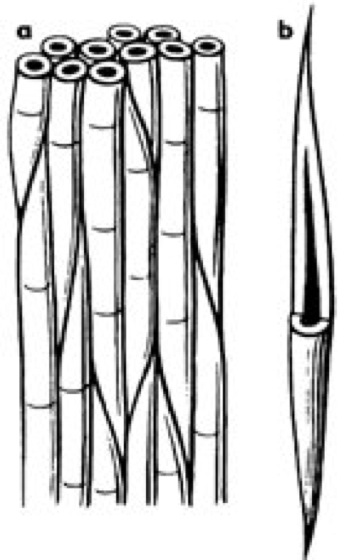Die sekundäre Rinde besteht oft aus regelmäßigen Schichten von Siebröhren, Geleitzellen und Parenchym einerseits (Weichbast) und Bastfasern (Sklerenchymfasern) andererseits (Hartbast), die miteinander abwechseln. Dieser Aufbau ist jedoch nicht die Folge einer Jahresringbildung. Hartbast-Faserstreifen verschiedener Laubbäume (Linde, Weide) wurden früher als Bindebast von Gärtnern benutzt. Die Abb. zeigt einen Teil eines isolierten Bastfaserbündels (a) und eine angeschnittene Bastzelle (b).