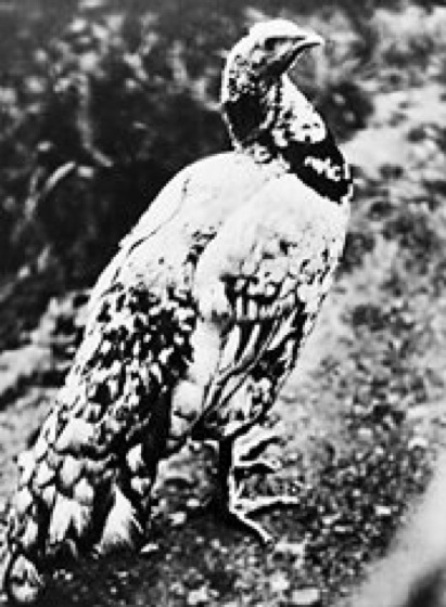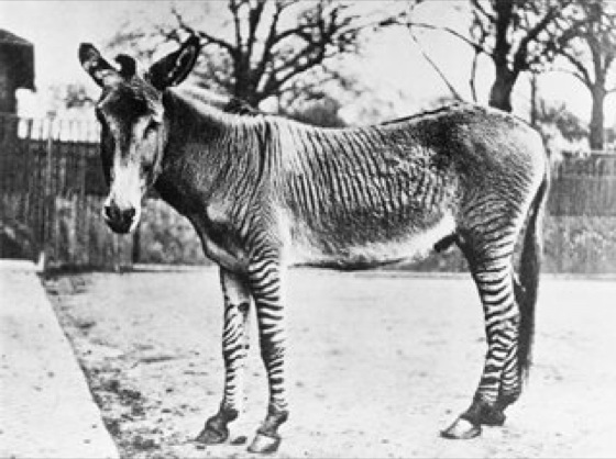 1 sehr seltener Bastard zwischen Haushuhn und Pfau. 2 Blendling aus Chapman-Zebra und Esel; die Streifung ist hier weit kräftiger ausgeprägt als beim Pferd-Zebra.