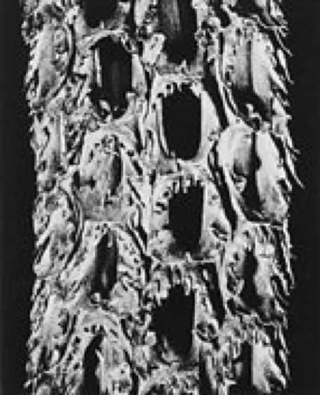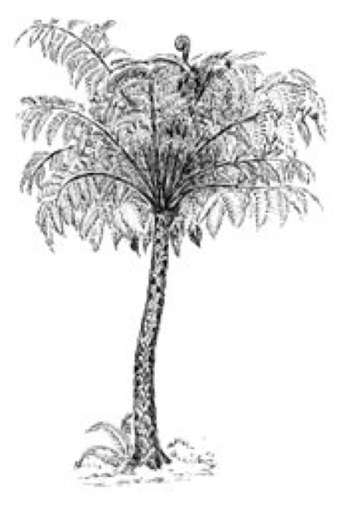 1 Baumfarn von Sri Lanka, Cyathea crinita. 2 "Scheinstamm" eines Baumfarns, bei dem die unverwachsene Form des Blattansatzgerippes besonders gut zum Ausdruck kommt.