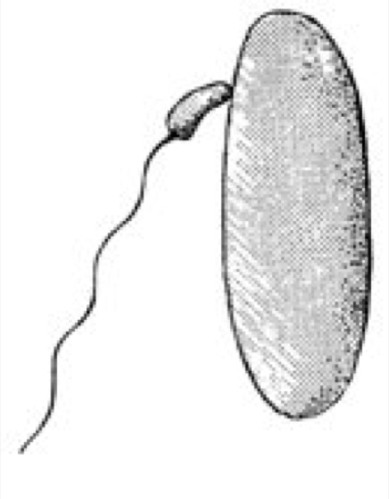 Anheftung von Bdellovibrio bacteriovorus an eine Pseudomonas-Zelle. Erstes Stadium des Befalls; anschließend dringt der parasitische Bdellovibrio in den periplasmatischen Raum des Wirtsbakteriums ein und lysiert die Zelle.