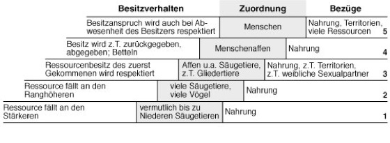 Besitzverhalten; bei Tier und Mensch gibt es verschiedene, z. T. stammesgeschichtlich gewachsene Formen des Umgangs mit Besitz ( vgl. Tab ). Die in der Tab. angeführten Stufen basieren auf den Arbeiten von H. Kummer und P. Hammerstein. Die stammesgeschichtliche Reihung wurde hypothetisch für die menschliche Ahnenreihe vorgenommen. In anderen Entwicklungslinien sind auch andere Reihungen wahrscheinlich; z. T. gibt es sogar Gliedertiere, bei denen als einziges Besitzverhalten der "Ressourcenbesitz des zuerst Gekommenen" (Stufe 3) beobachtet werden kann. Die Tab. zeigt hypothetisch, welche stammesgeschichtlichen Entwicklungsstufen notwendig waren, bevor die komplexen Besitznormen des Menschen entstehen konnten. Die neuen Stufen repräsentieren jeweils neue Entwicklungsschritte, enthalten aber meistens auch Verhaltenselemente aus den früheren Stufen. Mit der stammesgeschichtlichen Höherentwicklung sind die dem Besitzverhalten zugrundegelegten biologischen Programme zunehmend mit individuell Gelerntem verschränkt (Instinkt-Dressur-Verschränkung). – Beobachtungen zur 1. Stufe der Tab. (Ressource fällt an den Stärkeren) können häufig bei der Fütterung von Fischen und Schwanzlurchen, Beobachtungen zur 2. Stufe (Ressource fällt an den Ranghöheren)] z. B. auf dem Hühnerhof gemacht werden. Erwachsene Affen respektieren mitunter nur dann den Ressourcenbesitz des zuerst Gekommenen (Stufe 3), wenn der Besitzer des Gegenstands ihnen im Rang ähnlich ist. Auch Kleinkinder zeigen bereits diese Regel der Priorität, d. h., wer sich zuerst mit einem bestimmten Gegenstand beschäftigt, erwirbt damit einen vorübergehenden Besitzanspruch. Die Wegnahme dieses "Besitzes" führt beim "Dieb" zu erhöhter Automanipulation, einem Zeichen von Unsicherheit und Streß. – Im Tierreich kommt es normalerweise nicht vor, daß Nahrung freiwillig an erwachsene Individuen abgegeben wird. Eine Ausnahme bilden jedoch Schimpansen und möglicherweise auch die anderen Menschenaffen (Stufe 4). Frans de Waal beobachtete, daß Männchen der Zwergschimpansen (Bonobo) jene Weibchen beim Verteilen der Nahrung bevorzugen, bei denen die periodisch auftretende Brunftschwellung, die für die Männchen besonders attraktiv ist, gerade besonders ausgeprägt ist. J. Goodall berichtet von einer altersschwachen und invaliden Schimpansenfrau, die von ihrer Tochter Futter bekam. Bei Menschenaffen und Menschen sind Geben und Nehmen Bestandteile sozialer Strategien, sie helfen unter anderem, Bindungen zu stiften und zu erhalten. – Besitzverhalten wird ontogenetisch beim Menschen ab ca. 10 bis 12 Monaten bei der freundlichen Kontaktaufnahme eingesetzt. Vorschulkinder verwenden das Geben, Zeigen, Vorführen, Teilen und Zuwerfen von Objekten im Rahmen ihrer sozialen Strategien mit Altersgenossen und Erwachsenen. Auch Konflikte entzünden sich häufig über den Besitz eines begehrten Gegenstands. Das Anbieten eines Besitzgegenstands wird von Kindern jedoch auch zur Beschwichtigung von Aggression eingesetzt. In manchen Kulturen kann Geben und Nehmen auch die Funktion einer Sozialversicherung haben. Nur beim Menschen wird Besitz auch bei Abwesenheit des Besitzers respektiert (Stufe 5). Beim Menschen bezieht sich der Besitzanspruch auf eine große Anzahl von Gegenständen, aber auch auf funktionelle Äquivalente materiellen Besitzes und auf ideelle Werte. Beispiele dafür sind etwa vererbbare Rechte und geistiges Eigentum. Ein Äquivalent des Abgebens von Dingen sind "verbale Geschenke" wie Komplimente und gute Wünsche. Mit diesen Geschenken sind wir vor allem dann besonders großzügig, wenn es gilt, beim Abschied vor einer längeren Trennung die Bindung zu bekräftigen (Begrüßungsverhalten). I. Eibl-Eibesfeldt hat dokumentiert, daß bei vielen menschlichen Kulturen mitunter Verhaltensweisen aller 5 Stufen mit allen in der Tab. erwähnten Bezügen auftreten können. Normen, die mit Besitz in Zusammenhang stehen, werden von manchen Wissenschaftlern noch immer ausschließlich als Ergebnis soziokulturellen Lernens angesehen, obwohl die humanethologische Forschung (Humanethologie) belegt, daß die menschlichen Besitznormen Verschränkungen aus biologischem Erbe und kulturell Erlerntem sind. Es wird vermutlich weder durch Erziehung noch durch politische Beeinflussung gelingen, Kinder so aufwachsen zu lassen, daß sie kein Besitzstreben zeigen.