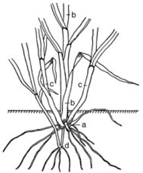 a Bestockungsknoten, aus dem der Haupttrieb b und die Seitentriebe c entstanden sind; d Rest des Samenkorns