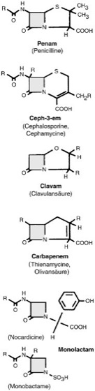 Grundstrukturen von β-Lactam-Antibiotika (in Klammern: Beispiele für Antibiotika)