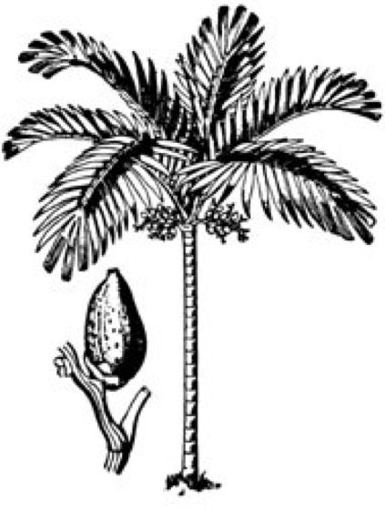 Betelnußpalmew [über port. betle von Malayalam vettila = Kaupfeffer], Areca catechu, ca. 15 m hohe Palmenart (Palmen), die nur als Kulturpflanze bekannt ist, deren Heimat jedoch in Hinterindien zu vermuten ist. Die Betelnußpalme ( ß vgl. Abb. ) wird ihrer von faserigem Fruchtfleisch umgebenen, länglichen, ca. 3 cm großen hartschaligen Samen wegen angebaut, die wichtiger Bestandteil des im gesamten asiatischen und ostafrikanischen Raum seit über 2000 Jahren weit verbreiteten Betelbissens sind. Die Betelnuß (Arecanuß) enthält etwa 0,3–0,6% Arecolin (Arecaalkaloide), in geringeren Mengen auch andere Alkaloide und ca. 15% Gerbstoffe. Nach Rösten oder Kochen werden die Samen in Scheiben geschnitten und zusammen mit etwas Kalk, aus der Gambirpflanze (Uncaria gambir) gewonnenem Gambirsaft (Gambir) und oft zusätzlichen Gewürzen in Blätter des Betelpfeffers (Piper betle;Pfeffergewächse) eingewickelt. Der Kalkzusatz bewirkt eine Freisetzung der Alkaloide, die zunächst an die Gerbsäuren gebunden sind. Beim Kauen erfolgt die Umwandlung (alkoholische Verseifung) des Arecolins in den Wirkstoff Arecaidin. Die Wirkung des Betelbissens ist anregend und euphorisierend, sein häufiger Genuß soll zu Suchterscheinungen (Sucht) führen. Der in der Betel"nuß" enthaltene Tannin-Farbstoff (Tannin) Arecarot färbt Lippen und Speichel der auf 200 Millionen geschätzten Betelnußkauer in Indien und Ostasien rot, während die Zähne allmählich schwarz werden. Dies gilt in Ländern, in denen der Betelbissen verbreitet ist, jedoch als Zeichen von Reichtum. Kulturpflanzen IX.