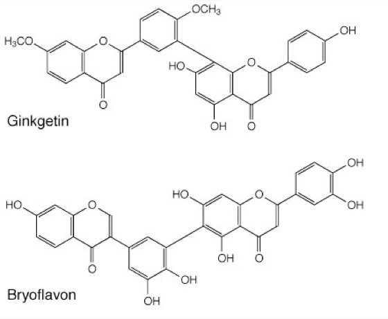 Biflavonoide, Klasse phenolischer sekundärer Pflanzenstoffe ( vgl. Tab. ); in Angiospermen (Bedecktsamer) seltener, in Gymnospermen (Nacktsamer) dagegen weit verbreitet (Ausnahme: Kieferngewächse). Für Laubmoose sind die Biflavonoide chemotaxonomische Leitsubstanzen. Die Synthese erfolgt meist aus zwei Molekülen mit dem Flavon-Grundgerüst (Beispiel: Ginkgetin, der Dimethylether des Amentoflavons, des Grundgerüstes der Biflavonoide), seltener aus je einem Flavon und Isoflavon (Beispiel: Bryoflavon, Laubmoose; vgl. Abb. ). Flavonoide.