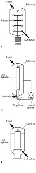 Beispiele für aerobe Bioreaktoren: a Rührreaktor, b Düsenumlauf-Reaktor, c Airlift-Bioreaktor