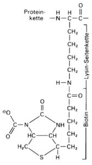 Biotin s [von griech. biotos = Leben], antiseborrhoisches Vitamin, wurde als Vitamin H ( vgl. Tab. ) aus Leber bzw. Eigelb isoliert; zyklisches Derivat des Harnstoffs mit Thiophenring (Ringsysteme). Biotin wird im Zellstoffwechsel als Coenzym kovalent über die Carboxylgruppe der Seitenkette mit ε-Aminogruppe eines Lysin-Rests (Lysin) an Enzyme (die sog. Biotin-Enzyme) gebunden ( vgl. Abb. ). In dieser Form kann an ein Stickstoffatom des Biotin-Rests Kohlendioxid angelagert werden (aktiviertes Kohlendioxid), das dann bei zahlreichen Carboxylierungs-Reaktionen (C1-Stoffwechsel) eingreift. Avidin, Biotin-Carboxylase, Biotin-Carboxyl-Carrier-Protein, Karrer (P.), Lynen (F.F.K.), Streptavidin, Ureaamidolyase, Vigneaud (V. du), Vitamine.
