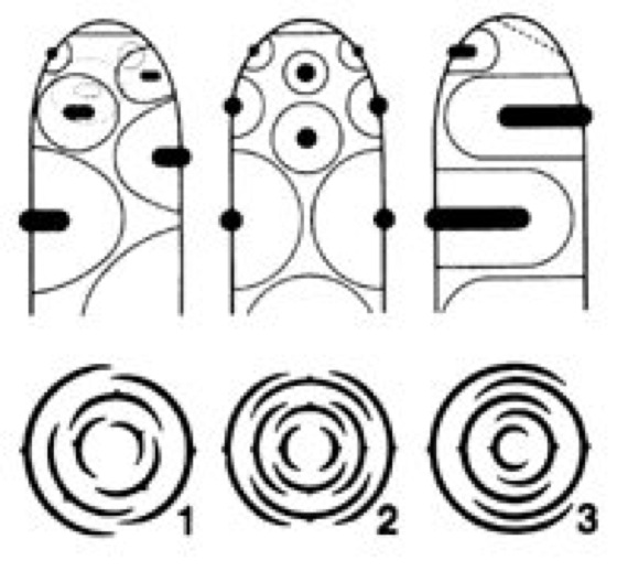 Die Blattanlagen sind schwarz eingetragen, darum herum die jeweiligen Hemmfelder. Oben Aufsicht, unten Blattstellungsdiagramme. 1 schraubige Stellung, 2 dekussierte Stellung, 3 distiche Stellung.