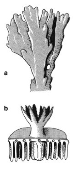 Blaue Koralle (Heliopora coerulea), a Habitus, b Einzelpolyp