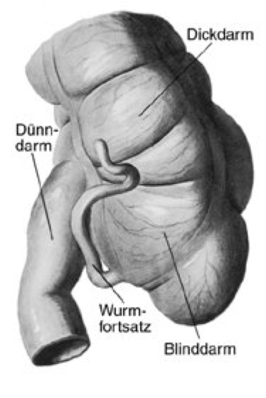 Blinddarm des Menschen (von hinten betrachtet). Die relativ häufige Entzündung des Wurmfortsatzes (Appendizitis) wird umgangssprachlich (nicht korrekt) als Blinddarmentzündung bezeichnet.