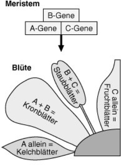 ABC-Modell der homöotischen Blühgene. Die Identität eines Blütenorgans (Kelchblatt, Kronblatt, Staubblatt, Fruchtblatt) wird durch die kombinierte (Kron- und Staubblätter) oder einfache (Kelch- und Fruchtblätter) Aktivität homöotischer Gene festgelegt.