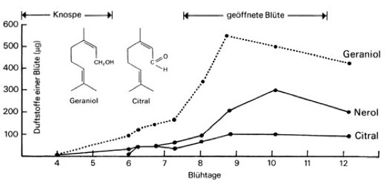 Mit dem Aufblühen der Blüte beginnt auch die Produktion der Duftstoffe, hier dargestellt von den wichtigsten Duftstoffen der Rose: Geraniol, Nerol und Citral.