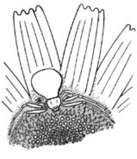 Blütenspinnen, die KrabbenspinnenMisumena vatia und Thomisus onustus, die sich an oder in Blüten aufhalten und dort auf Beute (vor allem blütenbesuchende Insekten) lauern ( ü vgl. Abb. ). Sie haben die Fähigkeit, die Körperfarbe innerhalb einiger Tage zu ändern (weiß, gelb), je nach Blüte, auf der sie sitzen. Wahrscheinlich beruht der Vorteil dieser Mimese darin, weder von der Beute noch von Freßfeinden gesehen zu werden.