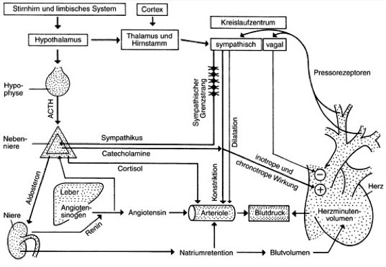 Blutdruckregulationw, das komplexe, fein abgestimmte Zusammenspiel der Herzrezeptoren und Pressorezeptoren (Barorezeptoren), der Kreislaufzentren im Gehirn und Rückenmark sowie der nervalen und hormonalen Steuermechanismen zur Anpassung des Blutdrucks an die jeweilige Kreislaufsituation (z. B. Blutdrucksteigerung bei Belastungen). Die Blutdruckregulation ist neben der Herzsteuerung der wichtigste Bestandteil einer Regulation des Blutkreislaufs. Die Abb. ( vgl. Abb. ) zeigt die Vielzahl der an der Blutdruckregulation beteiligten Faktoren und ihre genaue Einordnung in einen wirkungsvollen Regelkreis. Atmungsregulation, Atrial natriuretic factor, Carotissinus, Regelung.