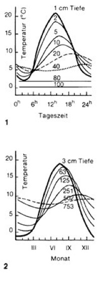 1 Täglicher Temperaturgang in einem Sandboden im Mai (Ergebnisse aus Messungen im Mai 1888 in Pawlowsk/Sibirien). 2 Jährlicher Temperaturgang in einem Boden (Ergebnisse aus 13 Jahre langen Messungen zwischen 1873 und 1886 in Königsberg)