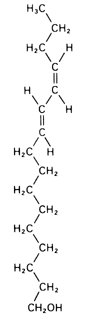 Bombykols [von *bomby -], trans-10-cis-12-hexadecadien-1-ol, ein zweifach ungesättigter, für den Menschen geruchloser Alkohol ( vgl. Abb. ), dessen Isolierung, Konstitutionsermittlung und Synthese 1959 im Arbeitskreis von A.F.J. Butenandt gelang. Bombykol, ein Pheromon (Sexuallockstoff) des weiblichen Seidenspinners(Bombyx mori), wird in ausstülpbaren Duftdrüsen (Sacculi laterales, zwischen dem 8. und 9. Abdominalsegment) des Weibchens gebildet und verteilt sich mit dem Luftstrom. Das Männchen, das den Reiz mit Sensillen auf seinen Antennen wahrnimmt, orientiert sich anhand des Duftstoffgradienten und bewegt sich unter ständigem Richtungswechsel zickzackartig auf das Weibchen zu. Für das Auslösen einer Reaktion beim Männchen reichen etwa 1000 Bombykol-Moleküle/cm3 im Luftstrom (entspricht einer gleichzeitigen Reizung von etwa 200 Rezeptorzellen, wobei bereits 1 Molekül Bombykol pro Rezeptorzelle einen Nervenimpuls auslöst). Ebenfalls Pheromone des Seidenspinners sind das Stereoisomere des Bombykols und Bombykal, der von Bombykol abgeleitete Aldehyd.