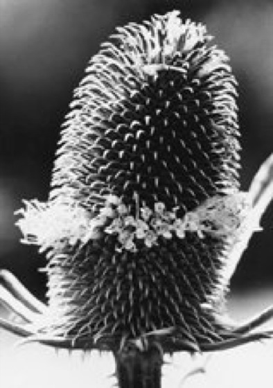 Die langen Deckblätter der Blüten eines Köpfchens der Kardendistel (Dipsacus); vereinzelt hängen aus den Blüten die Staubfäden mit den Staubbeuteln.