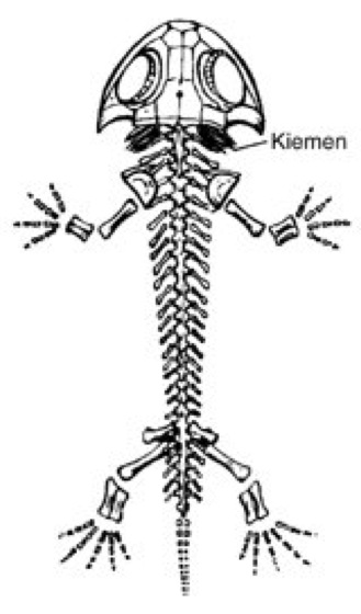 Branchiosaurier [von *branchio –, griech. sauros = Echse], Kiemensaurier, salamanderähnliche, 5–10 cm große, rhachitome (Rhachitomi) ausgestorbene Labyrinthodontia (Gattung Branchiosaurus) mit kurzem Schädel, äußeren Kiemen, langem Schwanz und geringer Skelettverknöcherung ( vgl. Abb. ). Credner erkannte 1886 die Larvennatur der Branchiosaurier; ihre Formenmannigfaltigkeit ist auf die unterschiedlichen Reifestadien zurückzuführen; äußere und innere Kiemen können zusammen vorkommen; fünfzehig, vierfingerig. Branchiosaurier bewohnten Sümpfe und Tümpel zur Zeit des Oberkarbons und Rotliegenden.