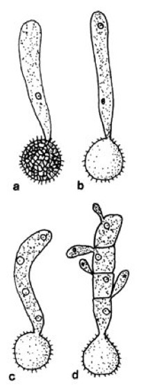 Keimung einer Brandspore von Ustilago scabiosae; es entsteht ein vierkerniger Keimschlauch (a–c), aus dem sich ein vierzelliges Promycel entwickelt, dessen Zellen jeweils ein Sporidium ausbilden (d).