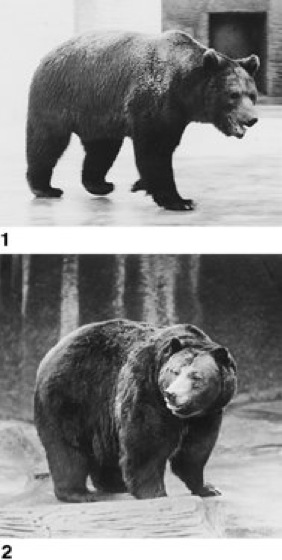 1 Kamtschatkabär (Ursus arctos beringianus), 2 Grizzlybär (Ursus arctos horribilis)