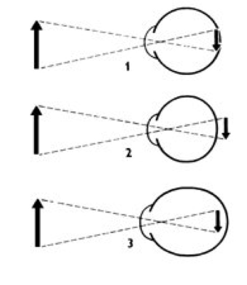 1 Normales Auge; Bild fällt auf die Netzhaut. 2 Weitsichtiges (zu kurzes) Auge; Bild fällt hinter die Netzhaut. Die Korrektur erfolgt durch eine Brille (bzw. Kontaktlinse) mit Konvexglas (Sammellinse), die das Gegenstandsbild wieder auf der Netzhaut erzeugt. 3 Kurzsichtiges (zu langes) Auge; Bild fällt vor die Netzhaut. Die Korrektur erfolgt durch eine Brille mit Konkavglas (Zerstreuungslinse), die das Gegenstandsbild wieder auf der Netzhaut erzeugt.