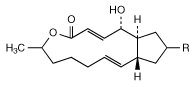 Brefeldine, Gruppe von Antibiotika aus Penicillium brefeldianum. Die wichtigste Verbindung ist das Brefeldin A (BFA), ein Makrolacton (C16H24O4, relative Molekülmasse 280,37). BFA ( vgl. Abb. ) ist mit Cyacin, Asotoxin und Decumbin identisch. Zur Erforschung von Transportprozessen wird BFA sowohl in tierischen als auch in pflanzlichen Zellen als Inhibitor für Exocytoseprozesse und Glykosylierungsvorgänge verwendet, wobei die inhibierende Wirkung nach Entfernung der Droge vollständig reversibel ist. In tierischen Zellen hemmt BFA den Transport z. B. von Proteinen und Polysacchariden vom Golgi-Apparat zur Plasmamembran und in die extrazelluläre Matrix, indem es die Bildung eines Hybridkompartiments aus Golgi-Vesikeln und Vesikeln des endoplasmatischen Reticulums induziert. Grundlage für diese Wirkung von BFA ist die Inhibition der Bildung von coated vesicles an den beiden Kompartimenten; insbesondere verhindert es die Aktivierung von ARF, einer GTPase, die für die Assemblierung des COPI-Komplexes (coated vesicles) unerläßlich ist. In pflanzlichen Zellen führt BFA zwar ebenfalls zur Desintegration des Golgi-Apparats, die Entstehung eines Hybridkompartiments konnte jedoch nicht nachgewiesen werden. Die verwendeten wirksamen Konzentrationen liegen zwischen 2 und 200 μg/ml.