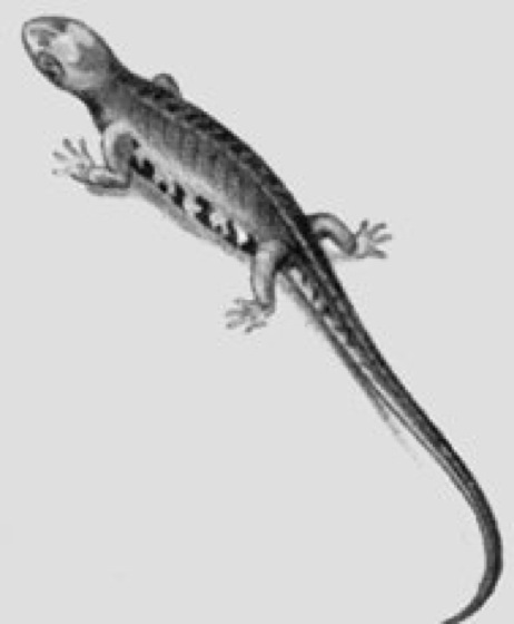 Brillensalamander, Salamandrina terdigitata, kaum 10 cm langer, schwärzlicher Vertreter der Salamandridae in Italien, mit gelblich-orange gefärbter Brillenzeichnung auf dem Kopf und nur 4 Zehen an den Füßen ( vgl. Abb. ). Die Lungen sind rückgebildet; terrestrische Lebensweise; das Weibchen setzt Eier in kleinen Trauben in langsam fließenden Bächen ab; fällt bei Hitze in Sommerschlaf.