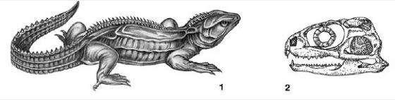 1 Habitus und 2 Schädel der Brückenechse.