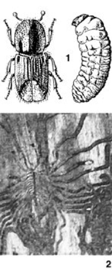 1 Buchdrucker (Ips typographus), Imago und Larve; 2 Schadspuren des Buchdruckers auf der Innenseite der Rinde