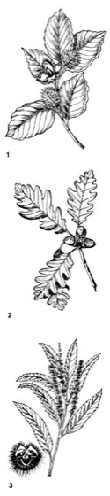 1 Rot-Buche (Fagus sylvatica), 2 Trauben-Eiche (Quercus petraea), 3 Edelkastanie (Castanea sativa)
